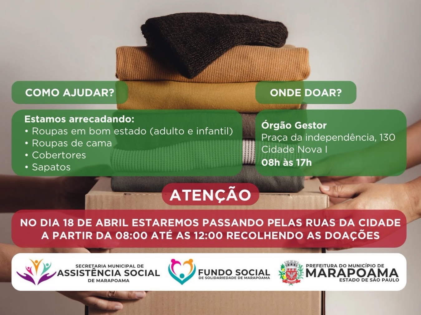 No próximo sábado, dia 18, a Prefeitura de Marapoama, por meio do Fundo Social de Solidariedade, dará início à Campanha do Agasalho 2026, com o objetivo de arrecadar roupas de inverno para famílias em situação de vulnerabilidade.