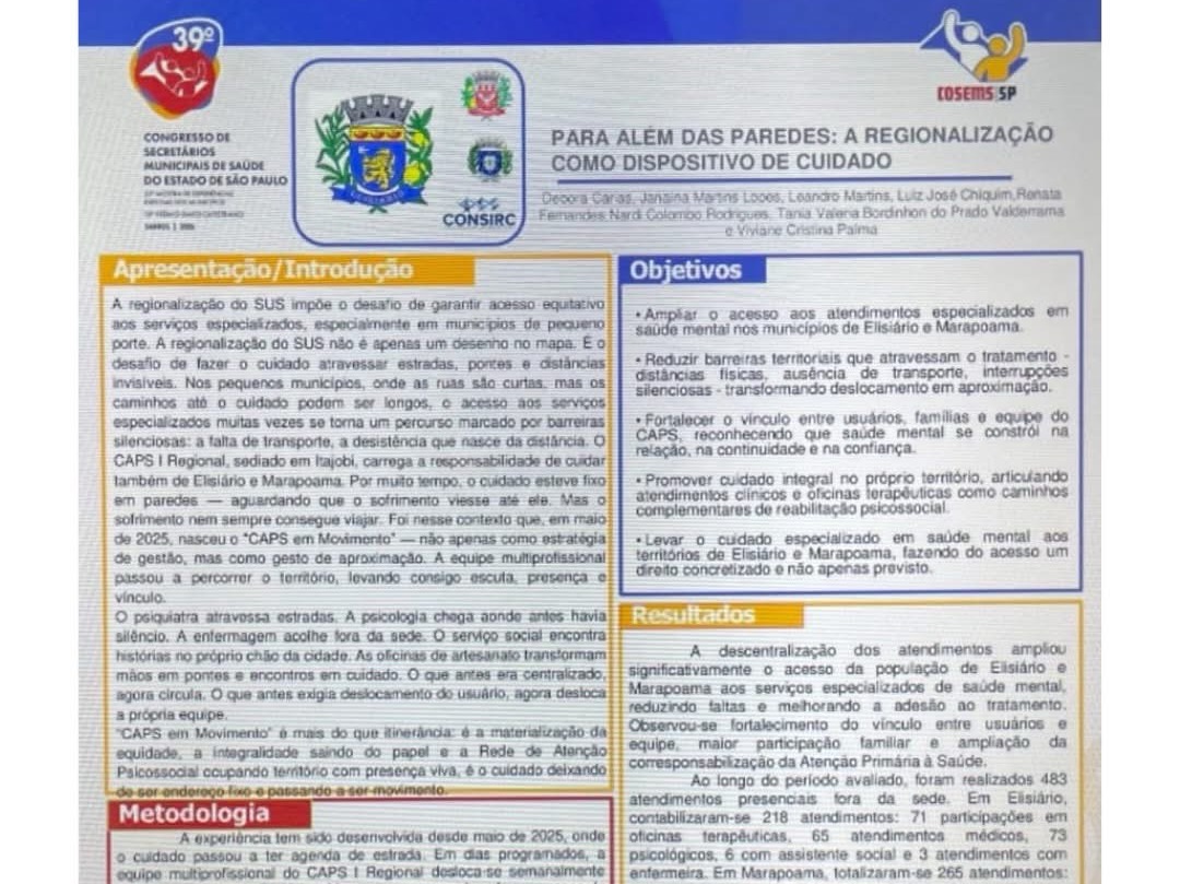 A premiação reconheceu a experiência intitulada “Para Além das Paredes: a Regionalização como Dispositivo do Cuidado”, uma iniciativa inovadora que tem transformado a forma de atendimento em saúde mental na região. O projeto propõe levar o cuidado diretamente aos territórios, aproximando os serviços da população, reduzindo barreiras de acesso e fortalecendo o vínculo entre usuários, famílias e equipes de saúde.