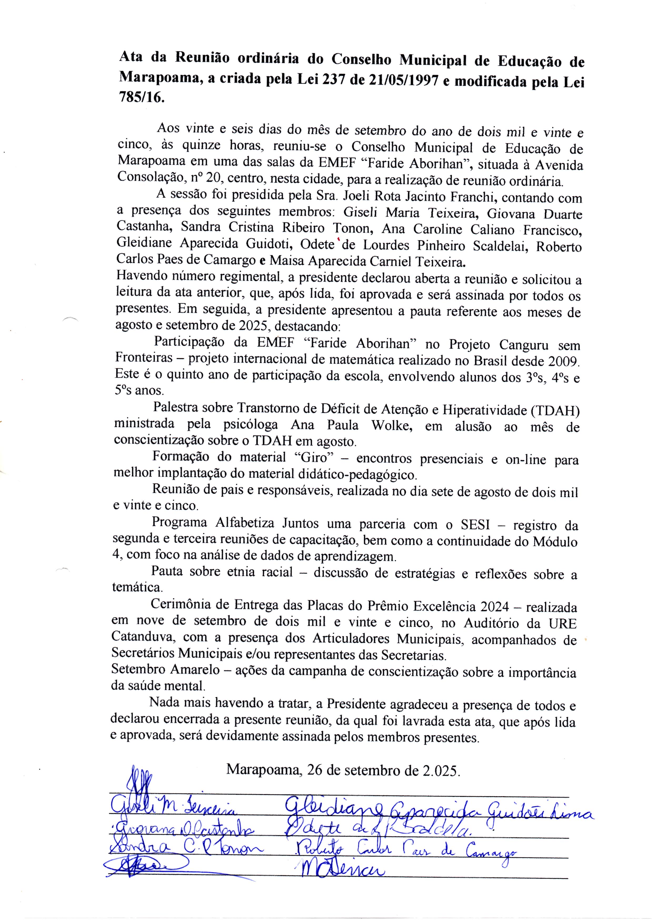 A Secretaria Municipal de Educação de Marapoama, no uso de suas atribuições, CONVOCA os (as) membros titulares do Conselho Municipal de Educação, a população em geral e demais interessados para reunião ordinária, a realizar-se no dia 25 de março de 2026, às 15:00h nas dependências da EMEF “Faride Aborihan” situada a Avenida Consolação nº20.